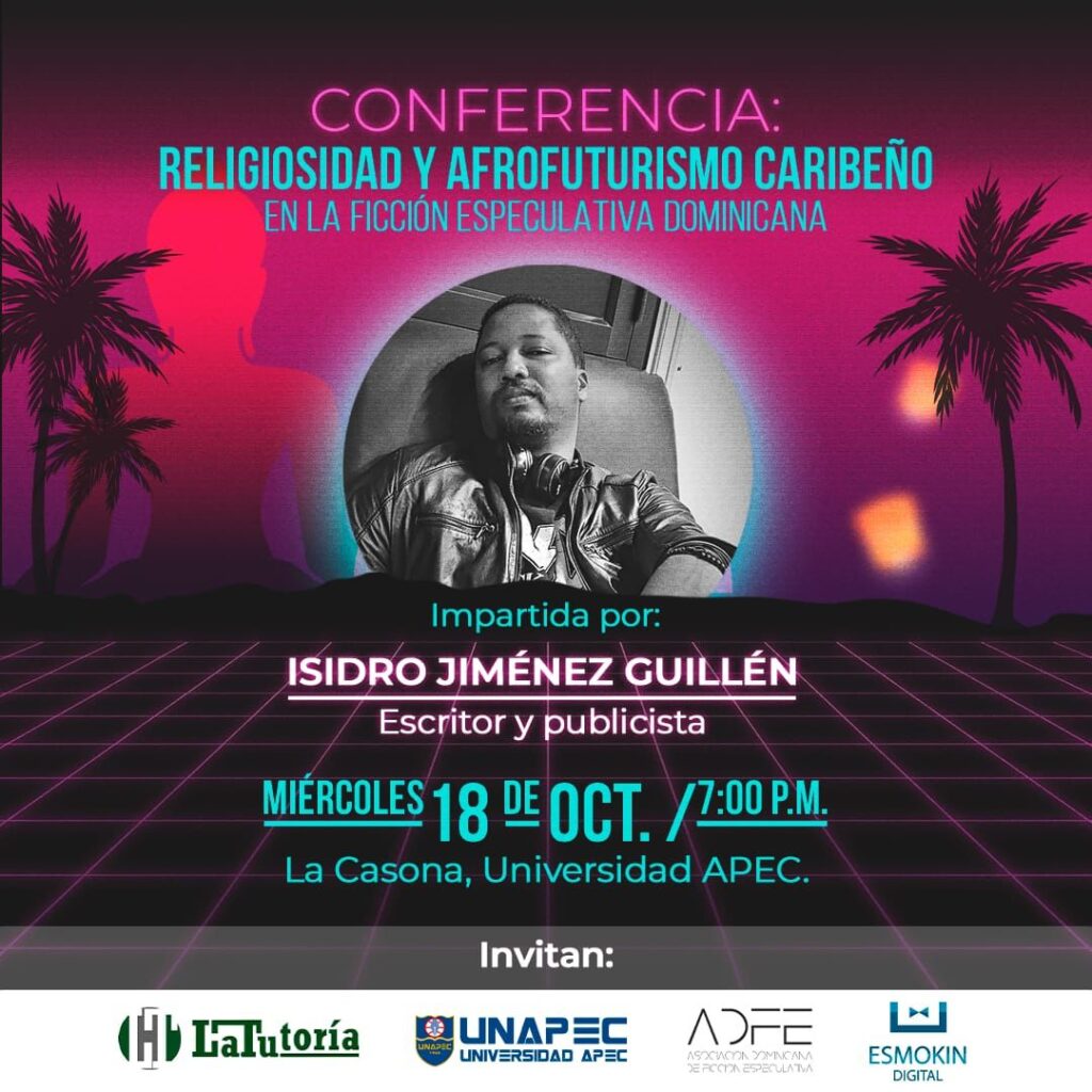 la Universidad APEC invita a la conferencia RELIGIOSIDAD Y AFROFUTURISMO CARIBEÑO EN LA FICCIÓN ESPECULATIVA DOMINICANA, el próximo miércoles 18 de octubre a las 7:00 p.m. impartida por el escritor y publicista Isidro Jiménez Guillén.