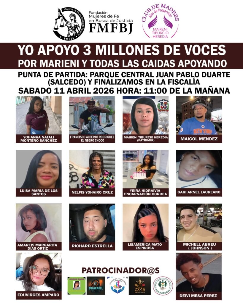 Salcedo. – Las organizaciones Madres de Fe en busca de Justicia y 3 Millones de Voces por Maireni y todas convocan a la ciudadanía a una caminata pacífica que se llevará a cabo este sábado 11 de abril de 2026, a las 11:00 de la mañana, en el municipio de Salcedo.